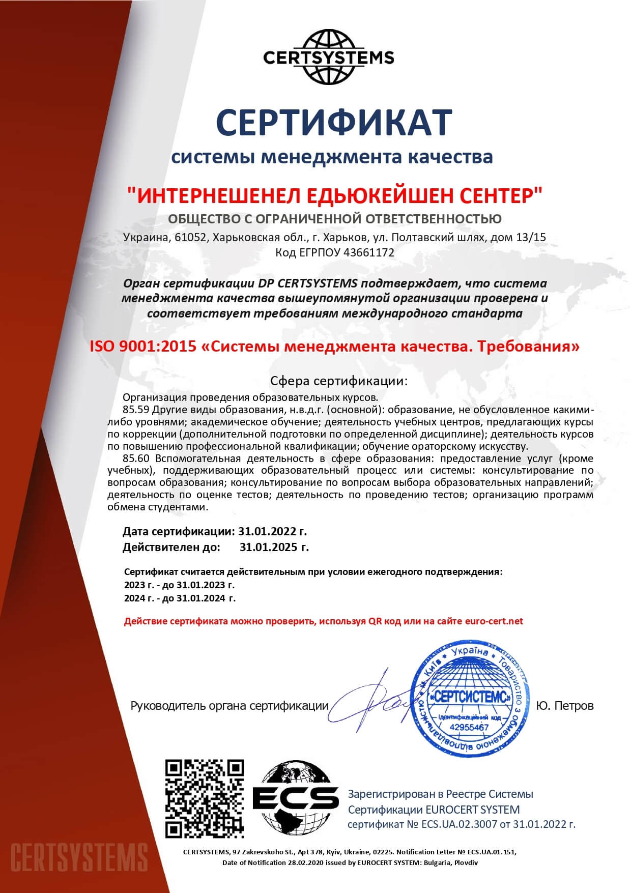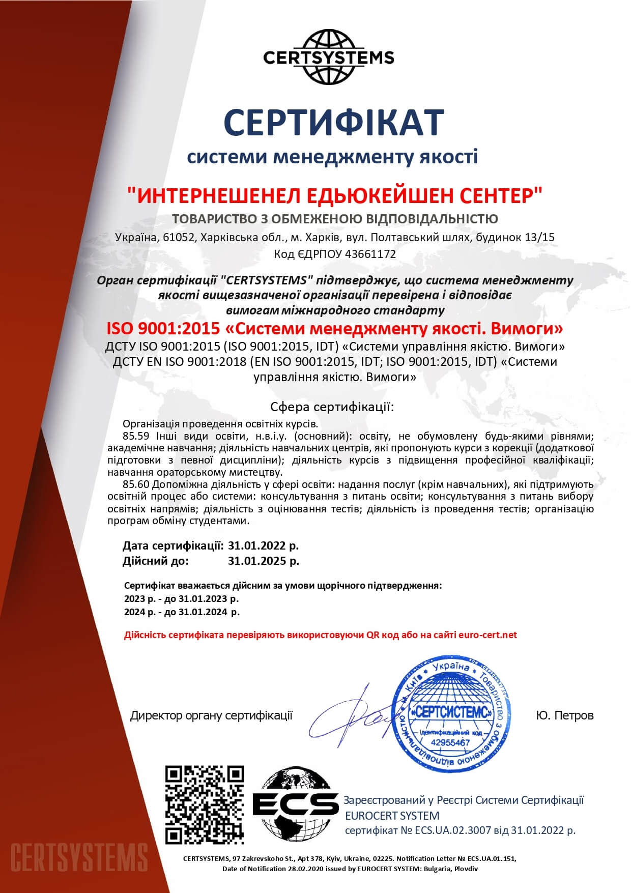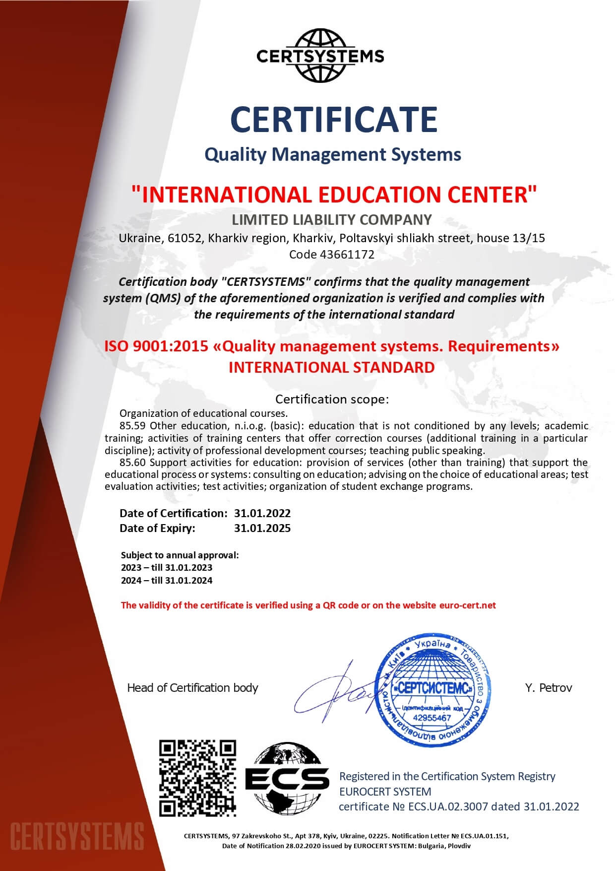 Наша школа офіційно сертифікована за міжнародним стандартом ISO 9001:2015, що гарантує:
